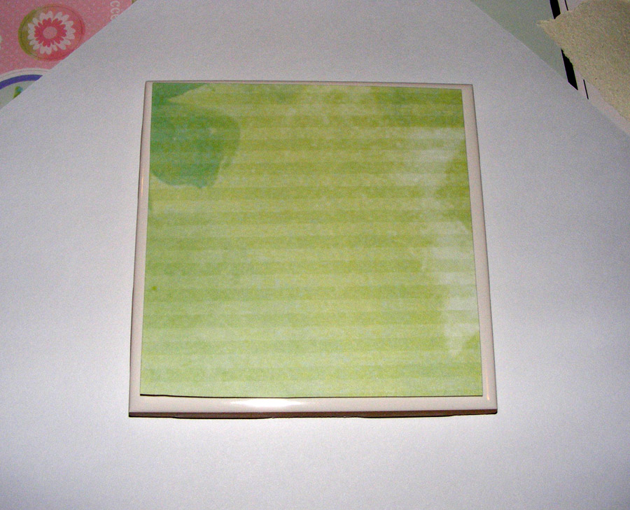 - Apply a THIN coat of mod podge to the top of your tile surface. Quickly place your paper square on top of the coaster, just on top of the wet mod podge. Rub your fingers over the edges and all areas of the paper after it has been applied to the coaster. This helps remove air bubbles and ensures a good seal. If you notice any edges are not sticking to the coaster, add a bit more mod podge and press gently with your finger. If you use too much mod podge, your paper may ripple or have air bubbles even after you press. It may take a bit of practice of your first go-round to figure out just how much mod podge is appropriate for your paper and tiles. Repeat this step on your remaining 3 coasters.